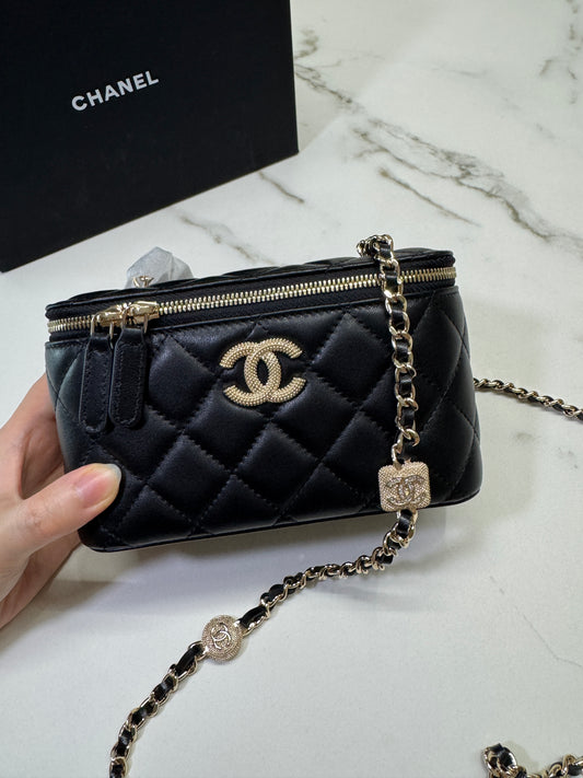 CHANEL 24K水鑽鏈條長盒 黑色羊皮