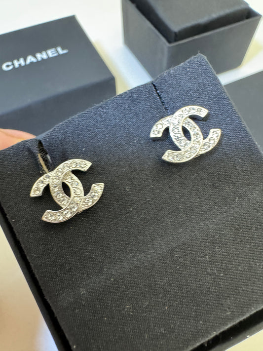 CHANEL 23V Mini水鑽耳環 銀色