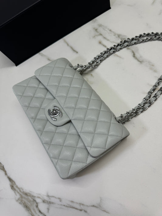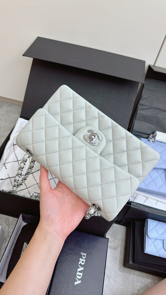 CHANEL CF23 淺灰藍色 魚子醬牛皮 銀扣